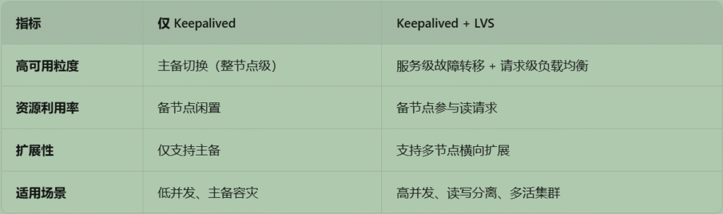 - VIP 漂移:通过虚拟 IP(VIP)在主备节点间切换,对外提供不间断服务。