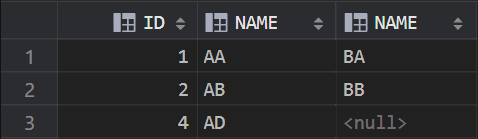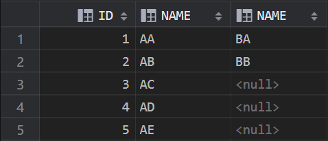 SELECT A.ID, A.NAME, B.NAME FROM LFINJI_A A LEFT JOIN LFINJI_B B ON A.ID = B.ID WHERE A.ATYPE = '1';