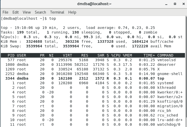 例如第二行表示 dmserver 进程信息:进程号 PID 为 1080,启动用户为 dmdba,进程优先级(越小优先级越高)为 20,nice 值(负值表示高优先级,正值表示低优先级)为 0,使用的虚拟内存为 3113996kb,使用的物理内存为 582512kb,使用的共享内存为 17176kb,进程处于休眠状态(S 表示休眠,R 表示正在运行, Z 表示僵死状态,N 表示该进程优先值为负数,I 表示空闲状态),占用的 CPU 使用率为 0.3%,使用的物理内存和总内存的百分比为 17.5%,使用的 CPU 时间总计 0:03.22(单位 1/100 秒),命令行为 dmserver。