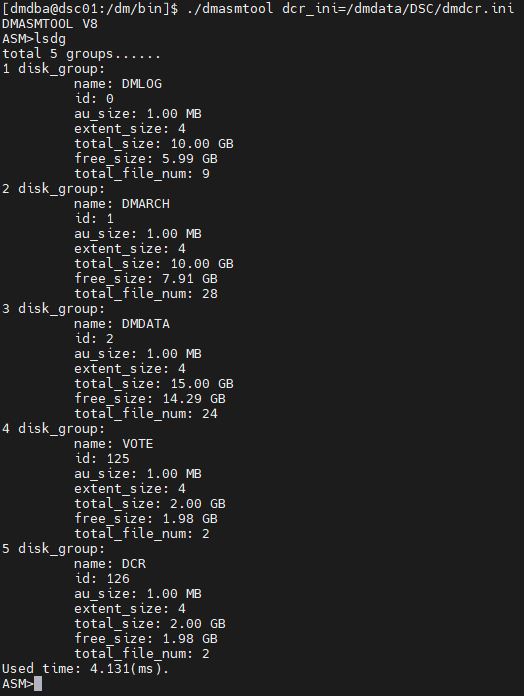 共享存储磁盘空间监控一般重点关注各部分使用率信息,可通过达梦自带的工具 dmasmtool 进行检查,命令如下: