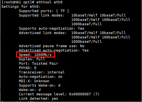 执行 ethtool eth0 命令后的结果中,主要需关注 Speed 的值。上图中可看出,该系统的 eth0 网卡速率为 1000Mb/s。