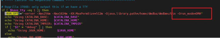 Linux:bin/catalina.sh -> JAVA_OPTS="-server -Xms256m -Xmx1024m -Djava.library.path=/home/dmdba/dmdbms/bin"