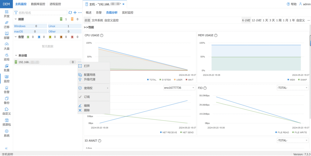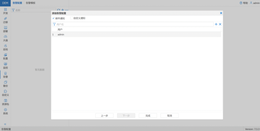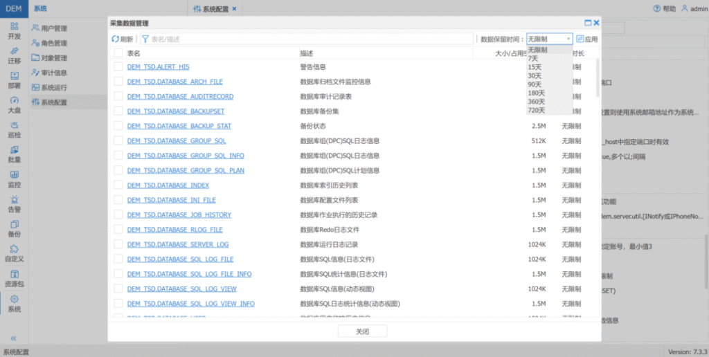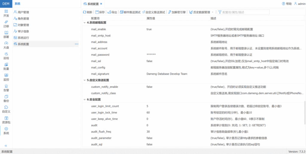 - 系统管理。DEM 工具提供了工具本身的系统配置与权限管理,方便不同用户同时使用工具,也可限制非 admin 用户的权限。
