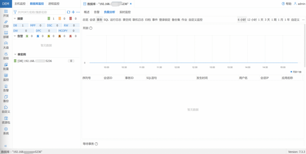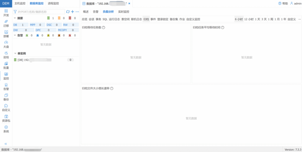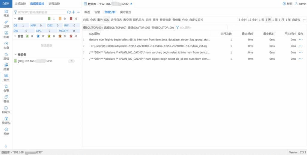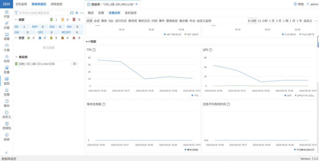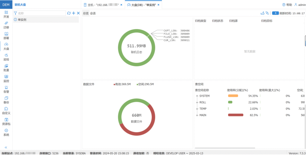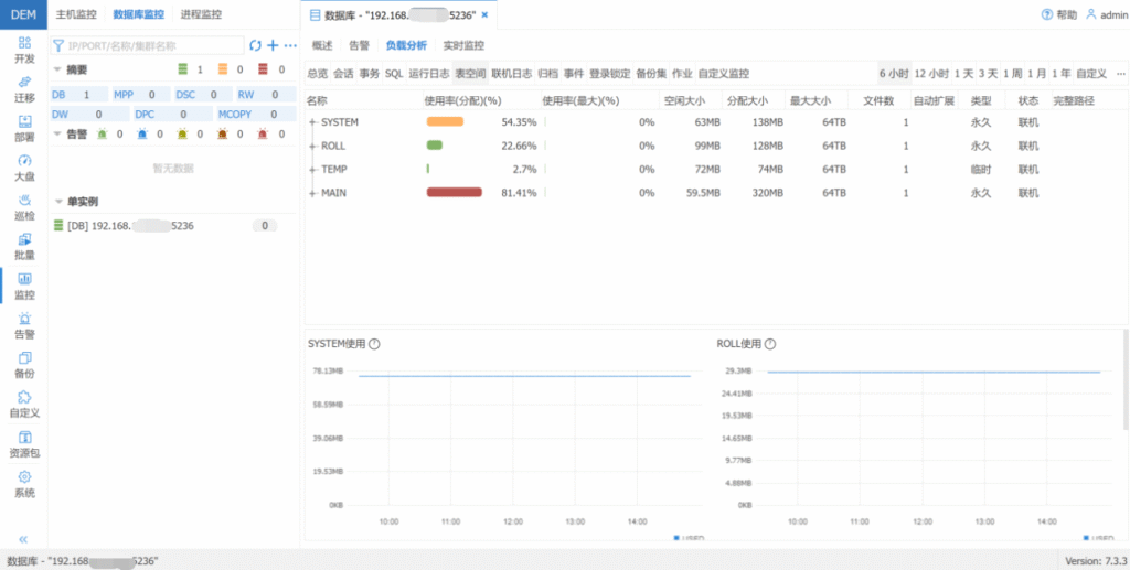 (4)其他:由于 DEM 会从被监视的数据库中获取信息到后台数据库,因此,建议生产环境中 DEM 数据的存储目录应不小于 100GB;其余的硬件要求与数据库单机部署一致。