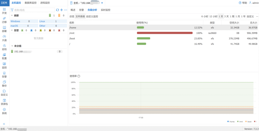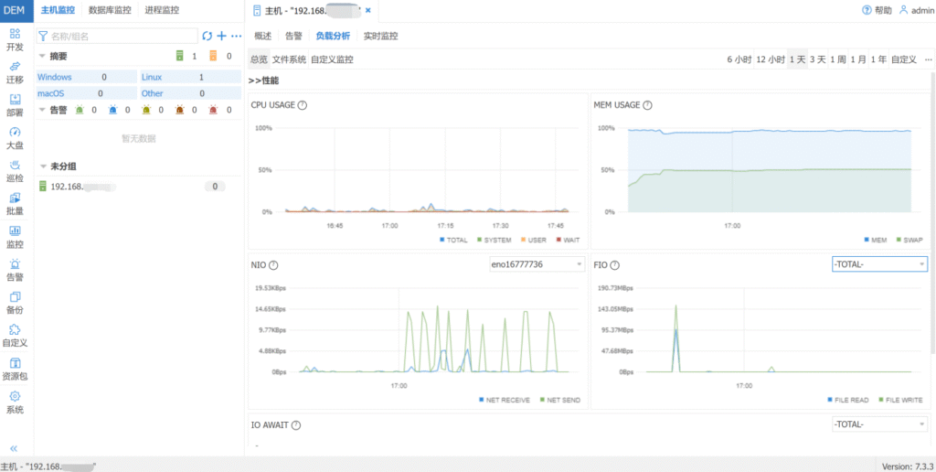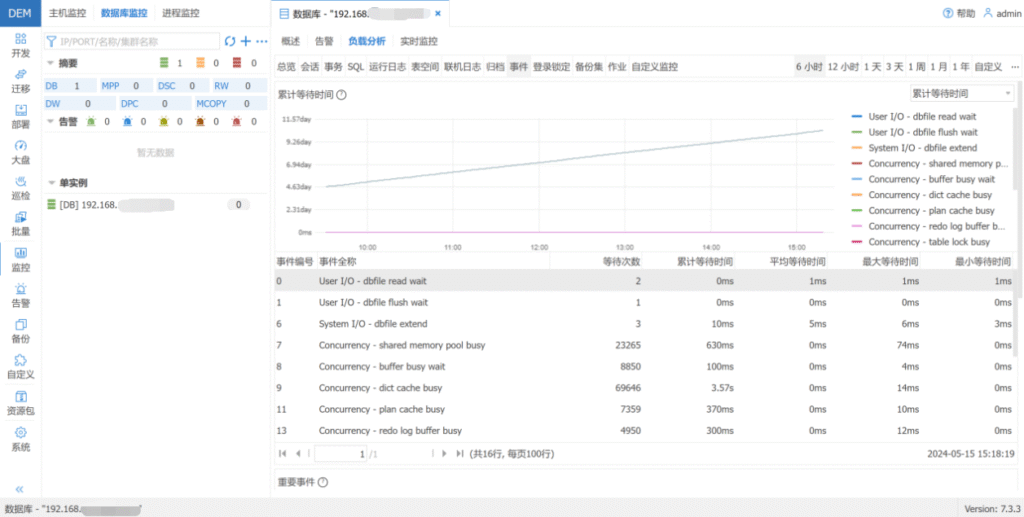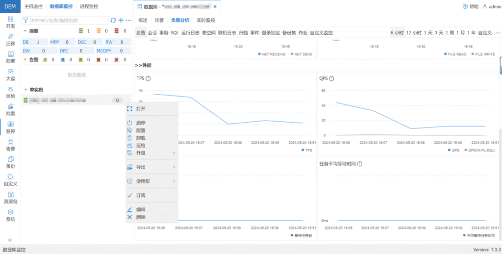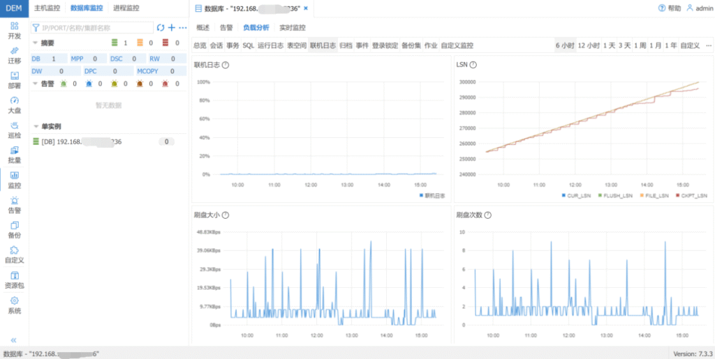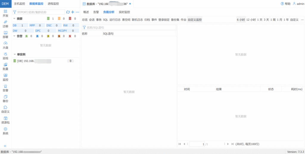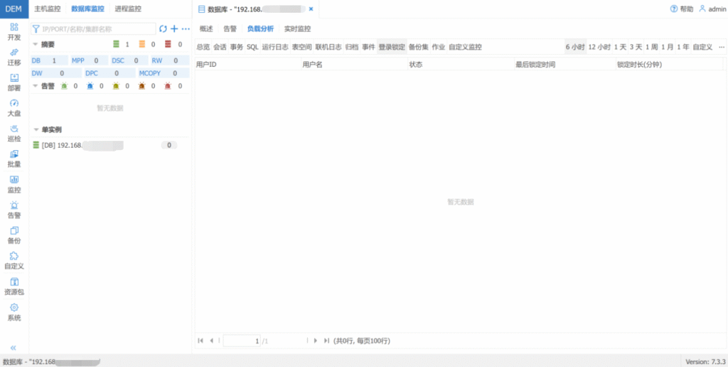 (4)其他:由于 DEM 会从被监视的数据库中获取信息到后台数据库,因此,建议生产环境中 DEM 数据的存储目录应不小于 100GB;其余的硬件要求与数据库单机部署一致。