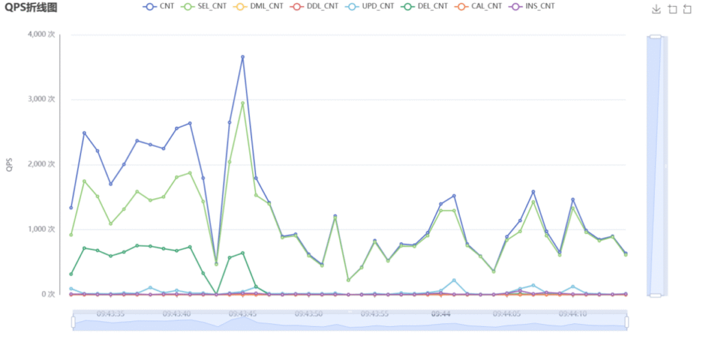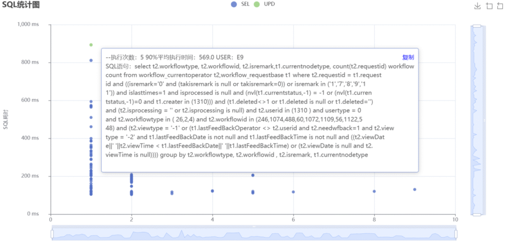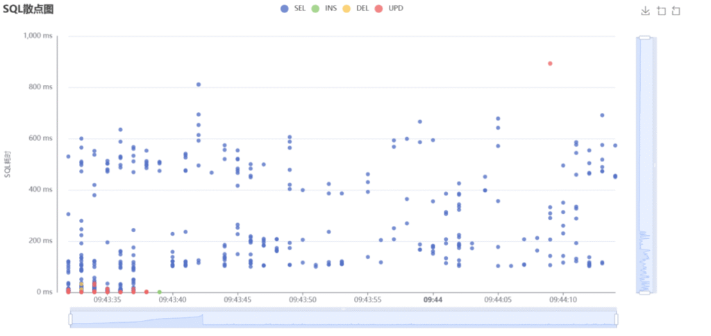 - 筛选 SEL/DDL/INS/CAL 等分类,只用点击去除或者选择对应类别,即可显示对应 sql 在图形上分布点。