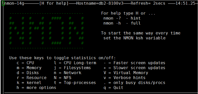 1.将 nmon 文件上传至自定义目录下例如 /opt/tool 目录下,然后执行 ./nmon,出现以下界面说明当前环境可以正常运行。