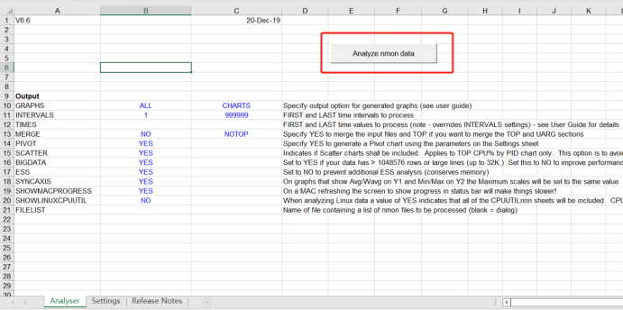使用方法:打开 nmon analyser v66.xlsm,使用 analyze nmon data 打开所需要分析的 nmon 日志文件,分析完成后保存成 excel 文件,即可查询系统资源的图表信息。