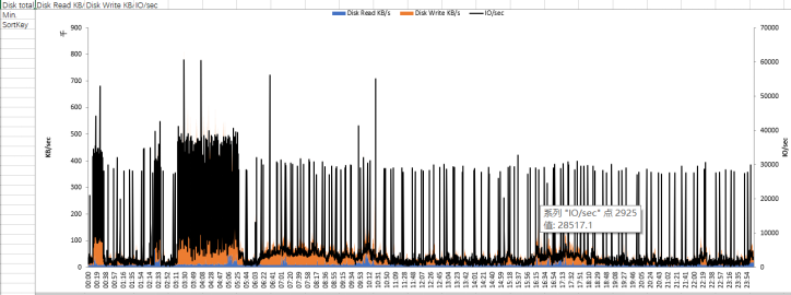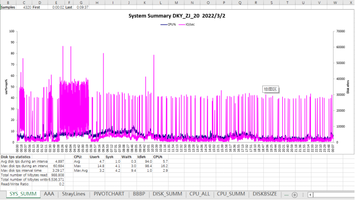 左纵轴为系统 cpu(user%+sys%)使用率,横轴为运行时长,右纵轴为系统磁盘传输(Disk xfers),蓝线表示系统 cpu 使用情况,粉红线表示系统 I/O 情况。坐标左下侧为统计信息,涉及系统 I/O 情况(一个采集间隔内的平均值、最大值、出现最大值的时间),系统 CPU 使用情况等。