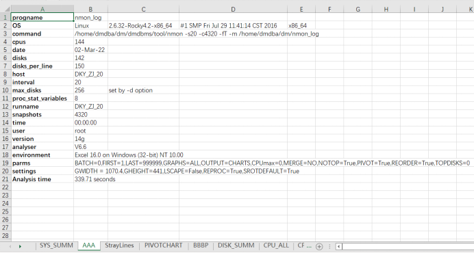 以下提供某系统中 NMON 监控一段时间后,利用 NMON_ANALYZER 工具分析生成的 Excel 报表,详细介绍该报表中多个子表的含义,以供参考。