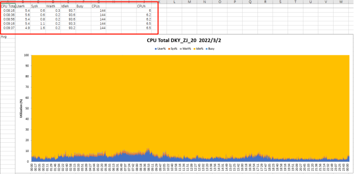 (5)Idel%:采集间隔内所有 CPU 处于空闲 Time 的占比(Avg、Max),此值和 User%,Sys%,Wait% 及 Steal% 之和等于 1;