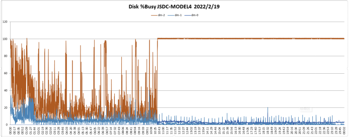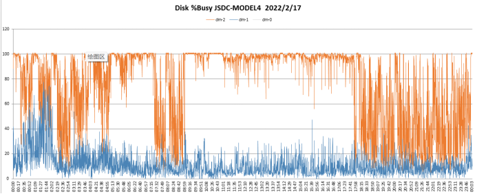 图中 dm2 对应磁盘 dbdata,dm1 对应 dbarch,dm0 对应 dbbak,从中我们可以看出在下班时间段,磁盘 IO 波动较大,但多数时间仍有空闲,上班时间段时磁盘 IO 几乎保持为 100% 繁忙状态,说明业务本身对数据库的读写压力就比较大。