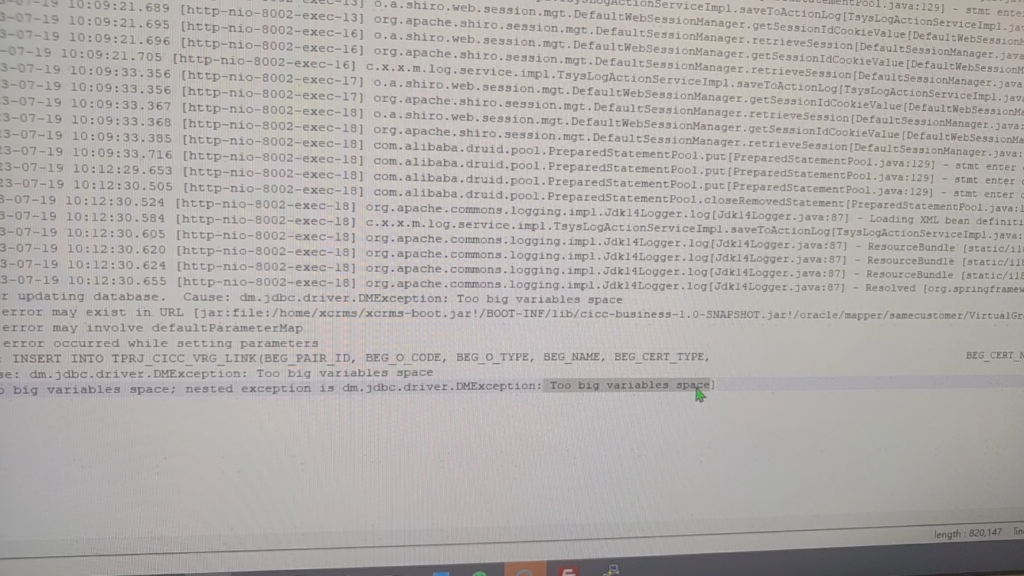 在执行SQL时插入数据,一条insert语句包含16个变量字段,一次性执行2000条insert语句。最终报错:Too big variables space[变量空间溢出]。