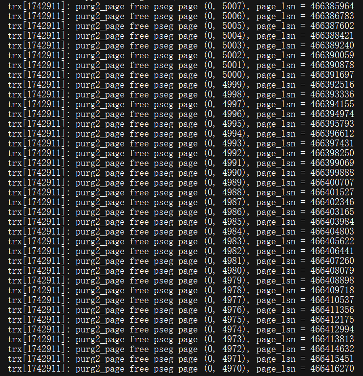 UNDO_RETENTION时间后,日志一定会出现大量purge操作,与此同时我们可以发现,做purge这个操作对应的TRX_ID记录的就是当初大事务的TRX_ID: